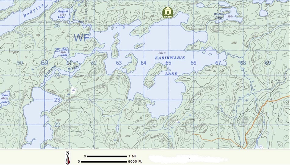Kabi is a nearby lake of 3 x 4 miles and one of our best lakes for big walleyes. With a waterfall dumping into it, a lazy river going out, islands with rocky points, drop-offs, weed beds, sunken islands and depths up to 60 feet, Kabi is a real jewel of a lake for fishing and beauty alike.